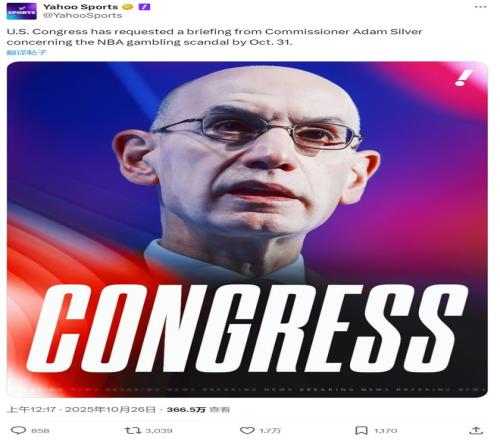 NBA 的赌球丑闻已从联盟内部风波,升级为惊动美国国会的重大事件!据雅虎体育报道,众议院能源与商业委员会正式介入调查,给 NBA 总裁亚当 - 萧华下了最后通牒:必须在 10 月 31 日前就系列赌博丑闻作出详细汇报。