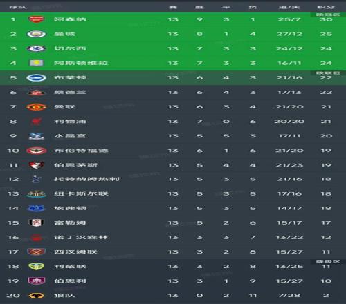 北京时间12月1日,随着切尔西1-1阿森纳的比赛结束,英超第13轮结束了所有比赛,最新积分榜如下!