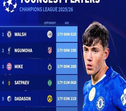 本赛季欧冠最年轻出场球员前10:切尔西小将雷吉沃尔什第1